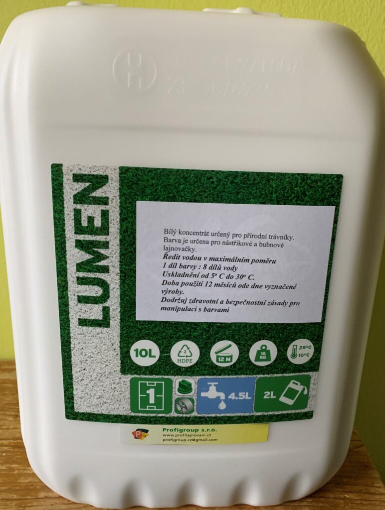 Lajnovací barva LUMEN v 10 l bandasce. Používá se především pro nástřikové lajnovačky. Jde o vodou ředitelnou barvu s přírodními látkami proti abiotickému šoku.  Maximální ředění je 1 díl barvy 8 dílů vody. Před použitím barvu řádně protřepat.